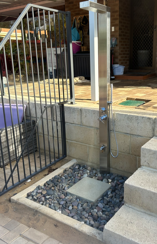 | Features | HEIGHT: 83"/210CM, WIDTH: 4.7"/12CM, DEPTH: 2.8"/7CM, BASE: 7.9"/20CM X 7.9"/20CM • Non-Corrosive Marine Grade 316 Stainless Steel • Complete Fully Plumbed In System for Hot & Cold Water • 10 years warranty on shower frame and 12 months warranty on all parts • Protection of vital parts with top and back covers • Easy Glide functionality for directional water flow diverter • In-built rainfall showerhead • Freestanding and wall mounting options (part of the kit) • 1.5m/59" Stainless Steel Hose with the Hand Held Shower • Standard 1/2" inlet connectors - Max Water Flow Pressure: 120 psi / Restricted to 80 psi 8.5L (liters per minute) As per the WELLS Regulations ( Adjustable) • Hand-Held Shower • Some Assembly required (showerhead), pre-water tested New Design Foot Water Spout with a Garden Hose Connection |