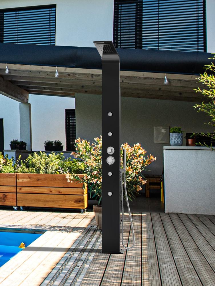 | Features | HEIGHT: 83"/210CM, WIDTH: 7.1"/18CM, DEPTH: 3"/7.5CM, BASE: 9.8"/25CM X 9.8"/25CM 10 YEARS WARRANTY ON FRAME & 12 MONTHS ON PARTS -INBUILT SHOWER HEAD WITH RAINFALL & WATERFALL FEATURES -4 X LATEST DESIGN MASSAGE JETS -59"/1.5M STAINLESS STEEL HOSE, HANDHELD SHOWER -ALL INTERNAL PARTS PROTECTED WITH TOP & BACK COVERS -DIRECTIONAL WATER FLOW DIVERTER WITH EASY GLIDE FUNCTION -PRE-INSTALLED PLUMBING INSIDE THE STAINLESS STEEL PANEL -316 BLACK (ION-PLATED) STAINLESS STEEL, MARINE-GRADE INDUSTRIAL-STRENGTH, WILL NOT RUST! -Max Water Flow Pressure: 120 psi / Restricted to 80 psi 8.5L (liters per minute) As per the WELLS Regulations ( Adjustable) -FREE STANDING & WALL MOUNTING OPTIONS -PERFECT HEIGHT FOR EVERYONE TO ENJOY |